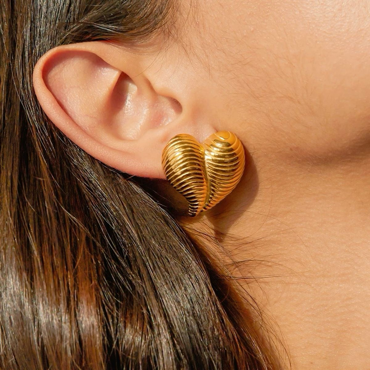 The 18K Gold Plated Ribbed Heart Stud Earrings are a perfect blend of elegance and sophistication. Crafted from high-quality stainless steel, these earrings feature a unique ribbed heart design that adds a touch of texture and dimension. The gold-plated finish ensures a luxurious shine, while the anti-tarnish properties keep them looking pristine for a long time. Designed to be hypoallergenic, these earrings are gentle on sensitive skin, providing all-day comfort.