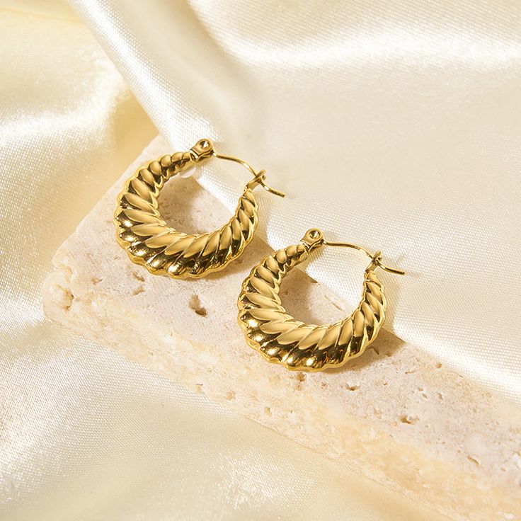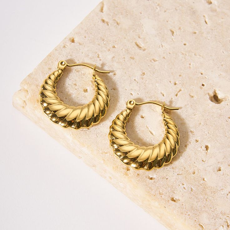 Elevate your style with these 18K gold plated Croissant Hoops, featuring a twisted, sculpted design inspired by the rich layers of a croissant. Crafted from high-quality stainless steel, these hypoallergenic earrings are anti-tarnish, ensuring lasting shine and comfort for sensitive skin. The luxe gold finish adds a timeless charm, making them perfect for everyday wear, special occasions, or gifting. Whether paired with casual outfits, office wear, or elegant evening looks, these hoops bring effortless sophistication to any ensemble.