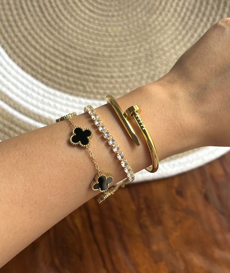 A perfect 3 bracelet set featuring a stylish Black Clover Bracelet, Tennis Bracelet, Nail Gold Bracelet Stack them together or wear solo — ideal for daily wear or gifting.
