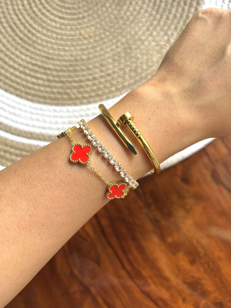 A perfect 3 bracelet set featuring a stylish Red Clover Bracelet, Tennis Bracelet, Nail Gold Bracelet Stack them together or wear solo — ideal for daily wear or gifting.