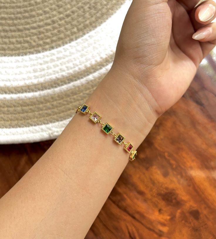 Design – A delicate bracelet with colorful square-cut stones set on a sleek gold plated chain.