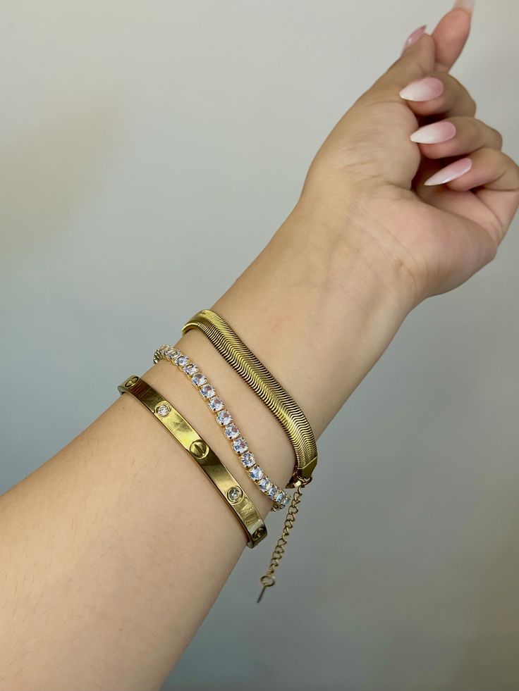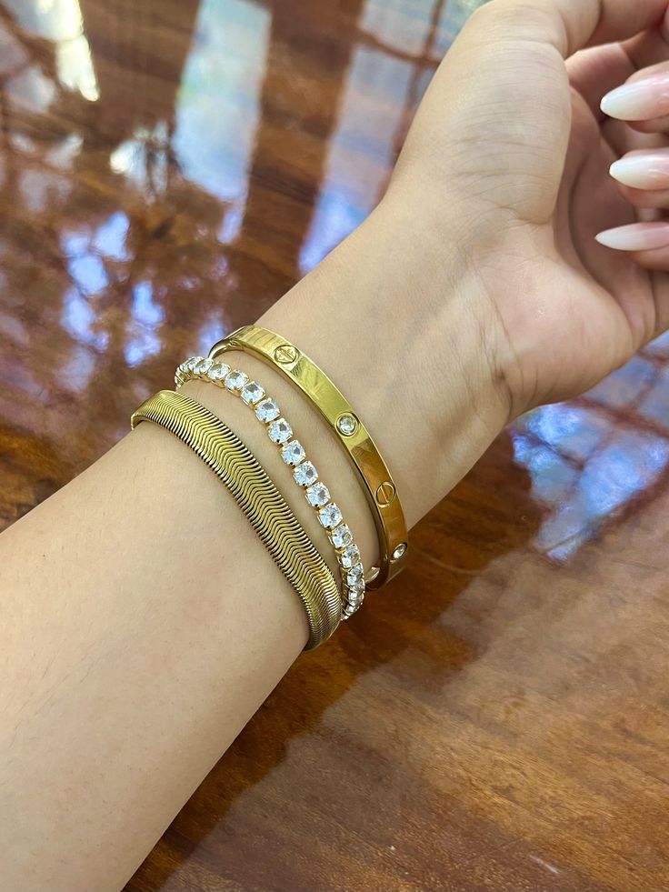 A bold yet elegant 3-piece gold bracelet set featuring a Sleek Gold Bracelet, Shiny Tennis Bracelet and a Charm Linked Bracelet . Perfect for everyday glam or layering up.