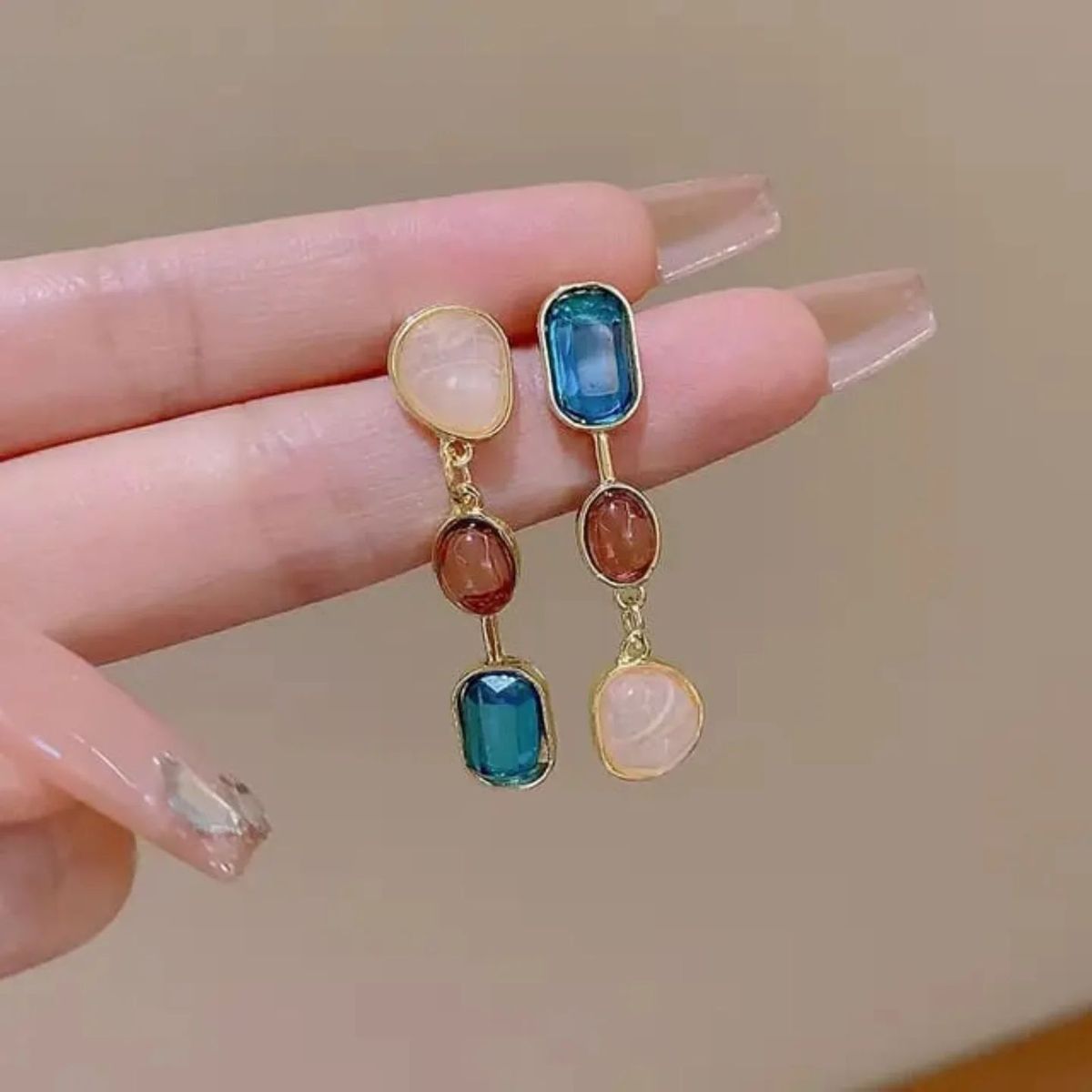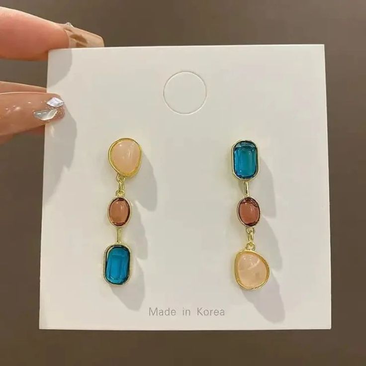 Add a graceful touch to your look with the Elegant Trine Gem Earrings. Featuring a trio of soft pink, wine red, and deep blue stones set in a sleek gold frame, these earrings blend color and elegance effortlessly. Their lightweight design ensures all-day comfort, while the timeless vertical drop style makes them perfect for both everyday wear and special occasions. Whether you're dressing up or gifting a loved one, these earrings are a charming choice. To keep them shining, store them in a soft pouch and avoid contact with water or perfumes.
