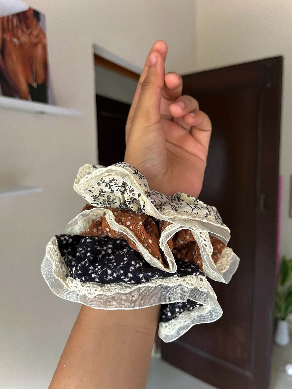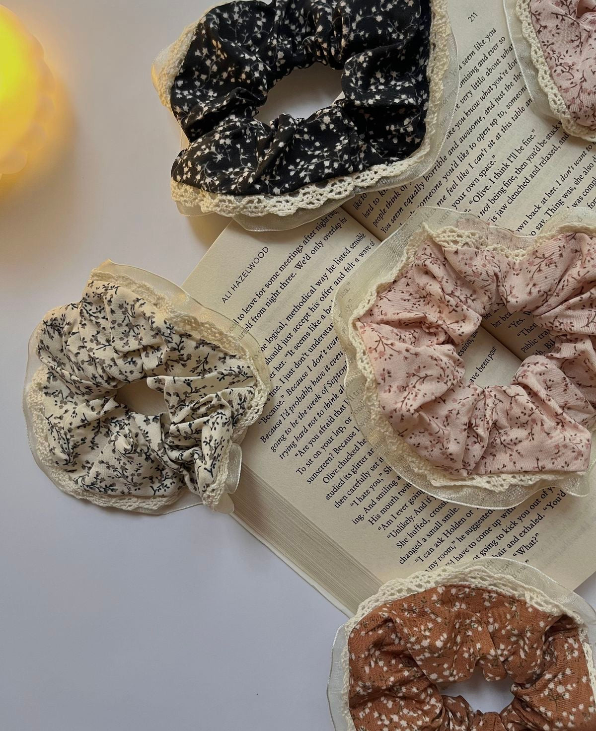 This Frill & Fluff Scrunchy adds a cute touch to any hairstyle. With lacy detailing and various prints, it's perfect for any look. Comes in a pack of 1, random color. Elevate your hair game with this must-have accessory.