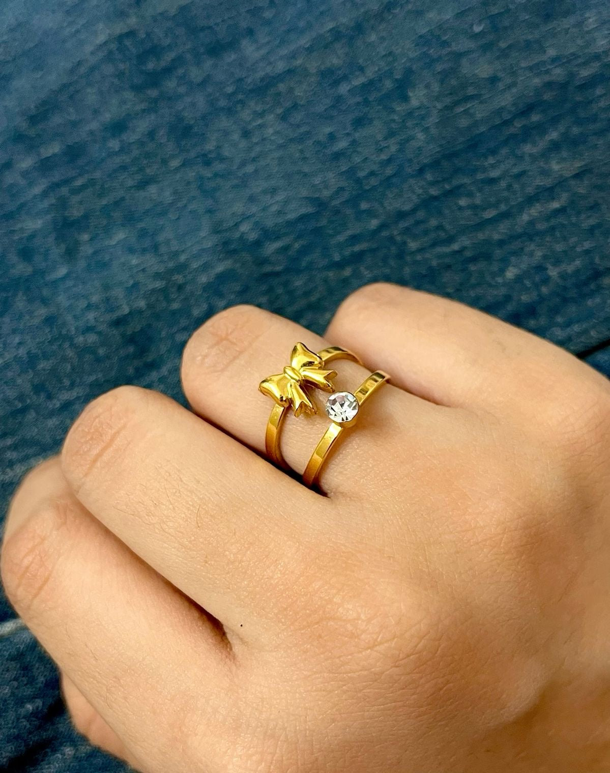 Delicate yet dreamy, the Bow Glow Adjustable Ring is a golden beauty that captures whimsy and elegance in one design. Featuring a dainty butterfly paired with a clear crystal accent, this ring is crafted from stainless steel and coated with 18K gold for a radiant, anti-tarnish finish. The adjustable fit ensures it’s perfect for everyday wear or gifting to someone special.
