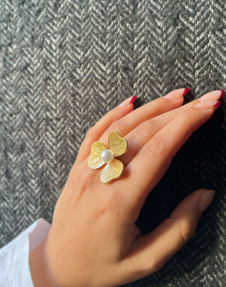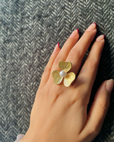 The Golden Blossom Pearl Ring is a stunning piece crafted from high-quality stainless steel with a gold-plated, anti-tarnish, and hypoallergenic finish, ensuring durability and comfort for all-day wear. Designed to be waterproof and long-lasting, this elegant ring features a delicate floral design with a luminous pearl centerpiece, adding a touch of timeless beauty. Perfect for special occasions like Valentine's Day, Promise Day, Engagement, and Proposals, this exquisite ring makes a meaningful gift that symbolizes love and commitment. Whether worn for a romantic evening, a sophisticated event, or daily elegance, this ring enhances any look with its graceful charm.