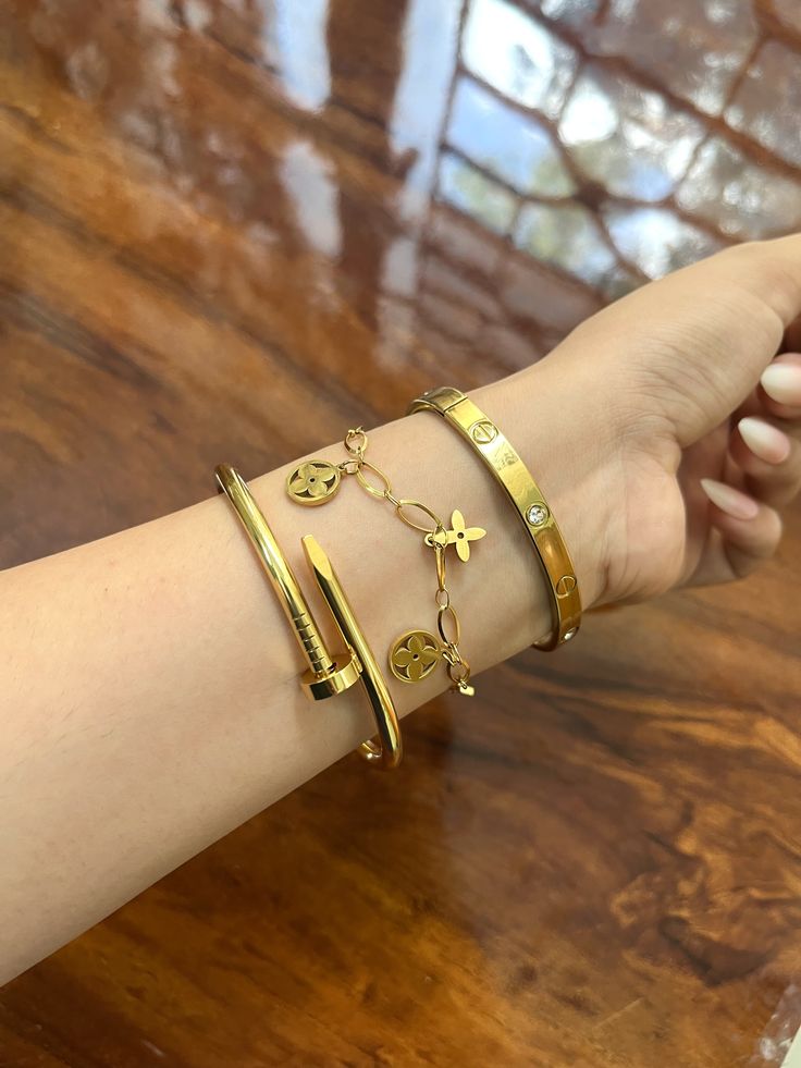 A bold yet elegant 3-piece gold bracelet set featuring a nail bangle, charm link bracelet, and Love band . Perfect for everyday glam or layering up.