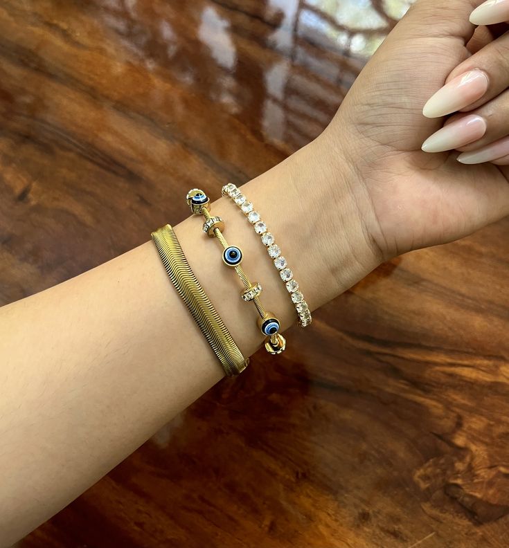 Includes: Evil Eye magnetic bangle, 1 gold herringbone chain bracelet, 1 stone-studded tennis bracelet
