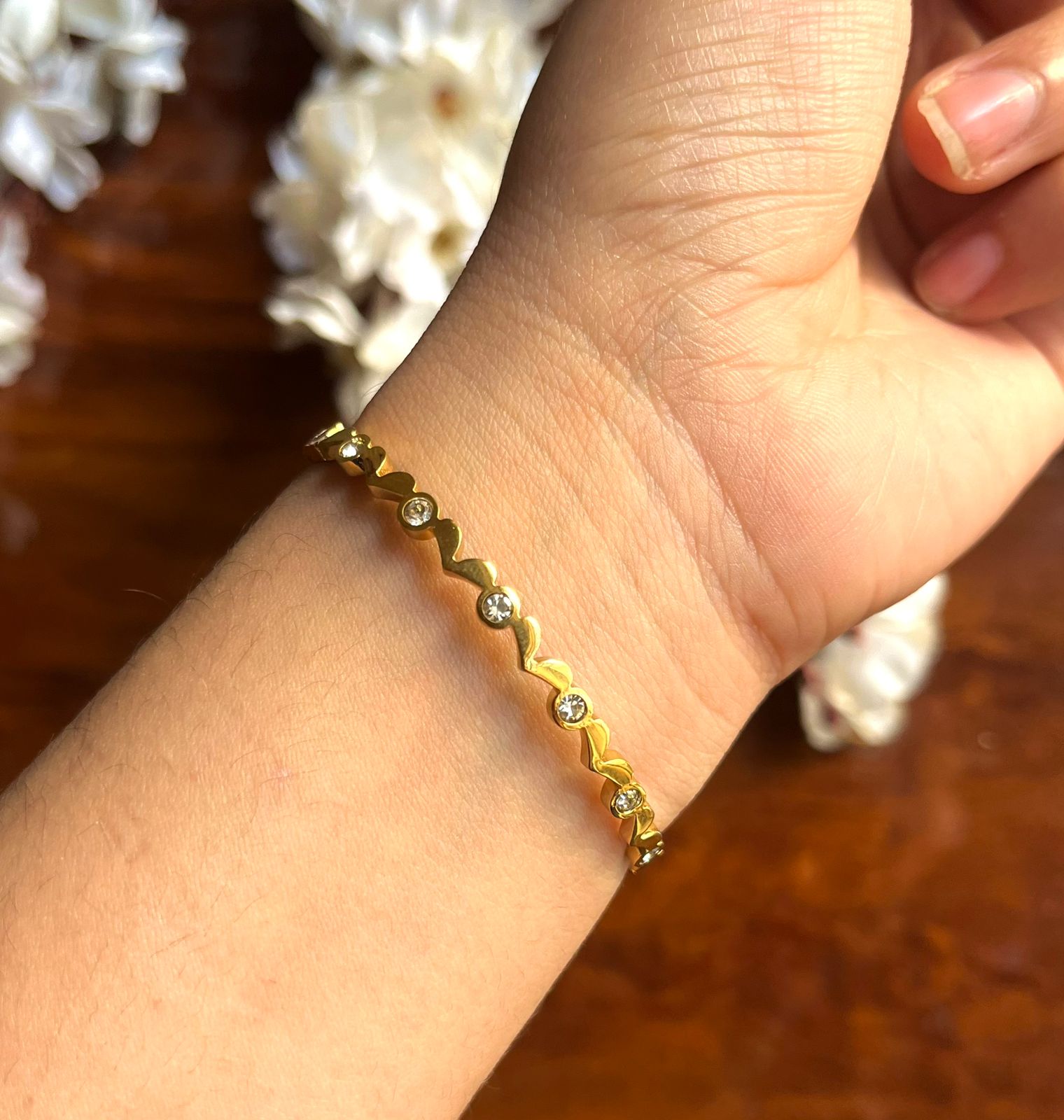 Designed especially for thin wrists (size 2.2–2.4), this elegant bracelet offers a snug yet comfortable fit without looking oversized. Crafted with high-quality plating, it is anti-tarnish, water-resistant, and sweat-proof, making it perfect for daily wear. Lightweight yet durable, this bracelet ensures long-lasting shine and a luxurious finish that complements every outfit.