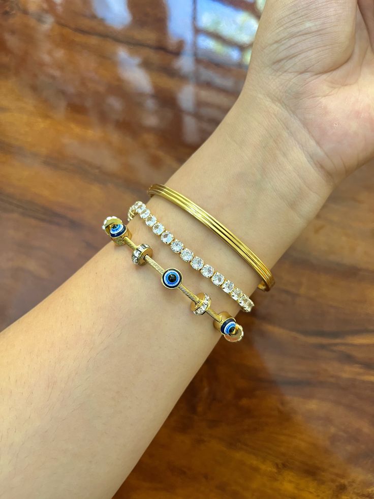 This trendy 3-piece bracelet stack includes a Evil Eye Magnetic Kada, Sleek Gold Finishes Bangle and a shiny Tennis Bracelet. Perfect for layering or wearing solo, it adds instant glam to any outfit.