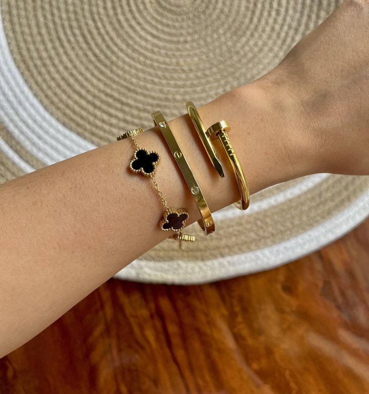 A perfect 3 bracelet set featuring a stylish Black Clover Bracelet, love band gold, Nail Gold Bracelet Stack them together or wear solo — ideal for daily wear or gifting.