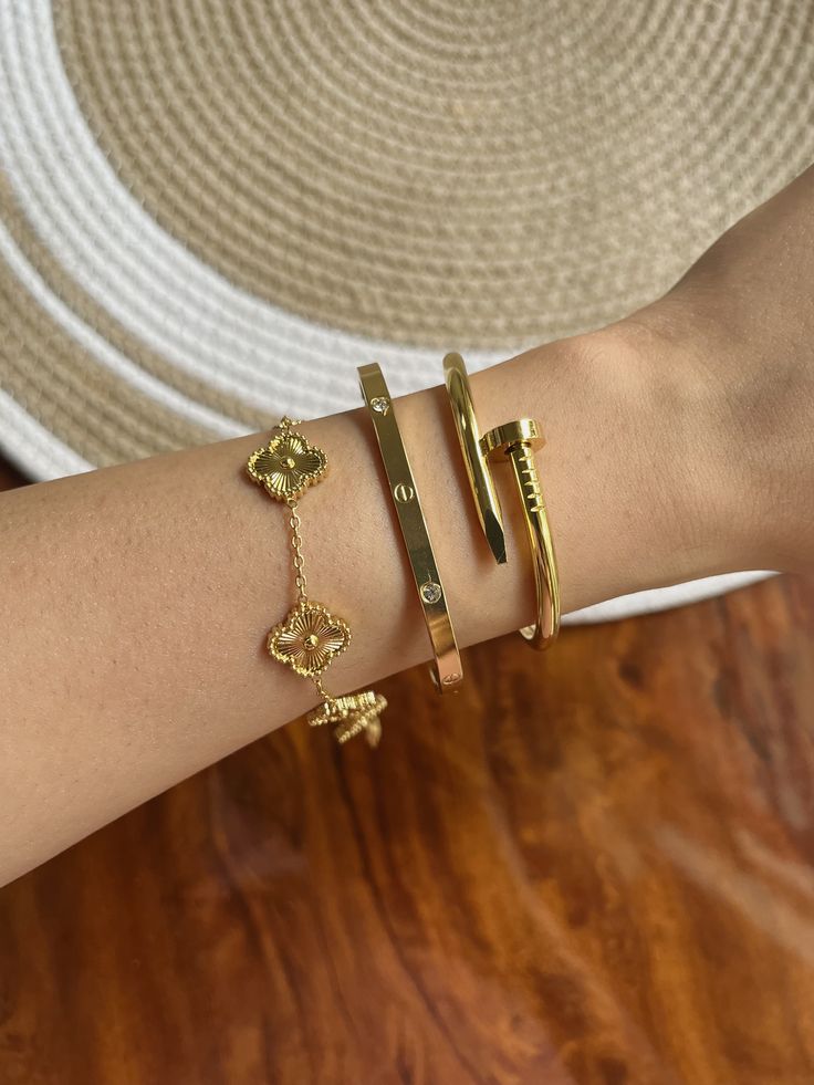 A perfect 3 bracelet set featuring a stylish Gold Clover Bracelet, love band gold, Nail Gold Bracelet Stack them together or wear solo — ideal for daily wear or gifting.
