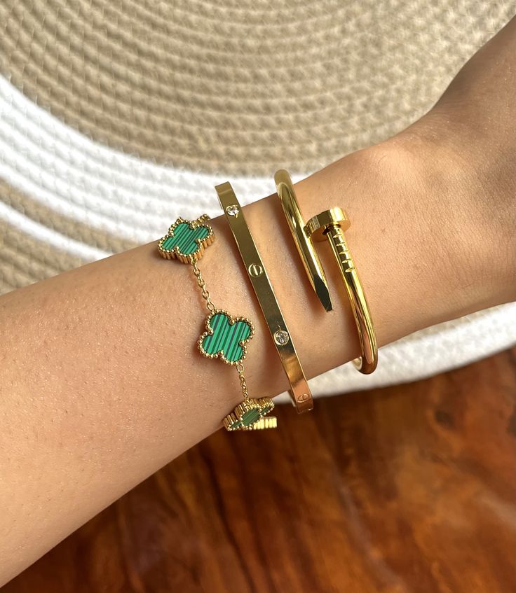 A perfect 3 bracelet set featuring a stylish Green Clover Bracelet, love band gold, Nail Gold Bracelet Stack them together or wear solo — ideal for daily wear or gifting.