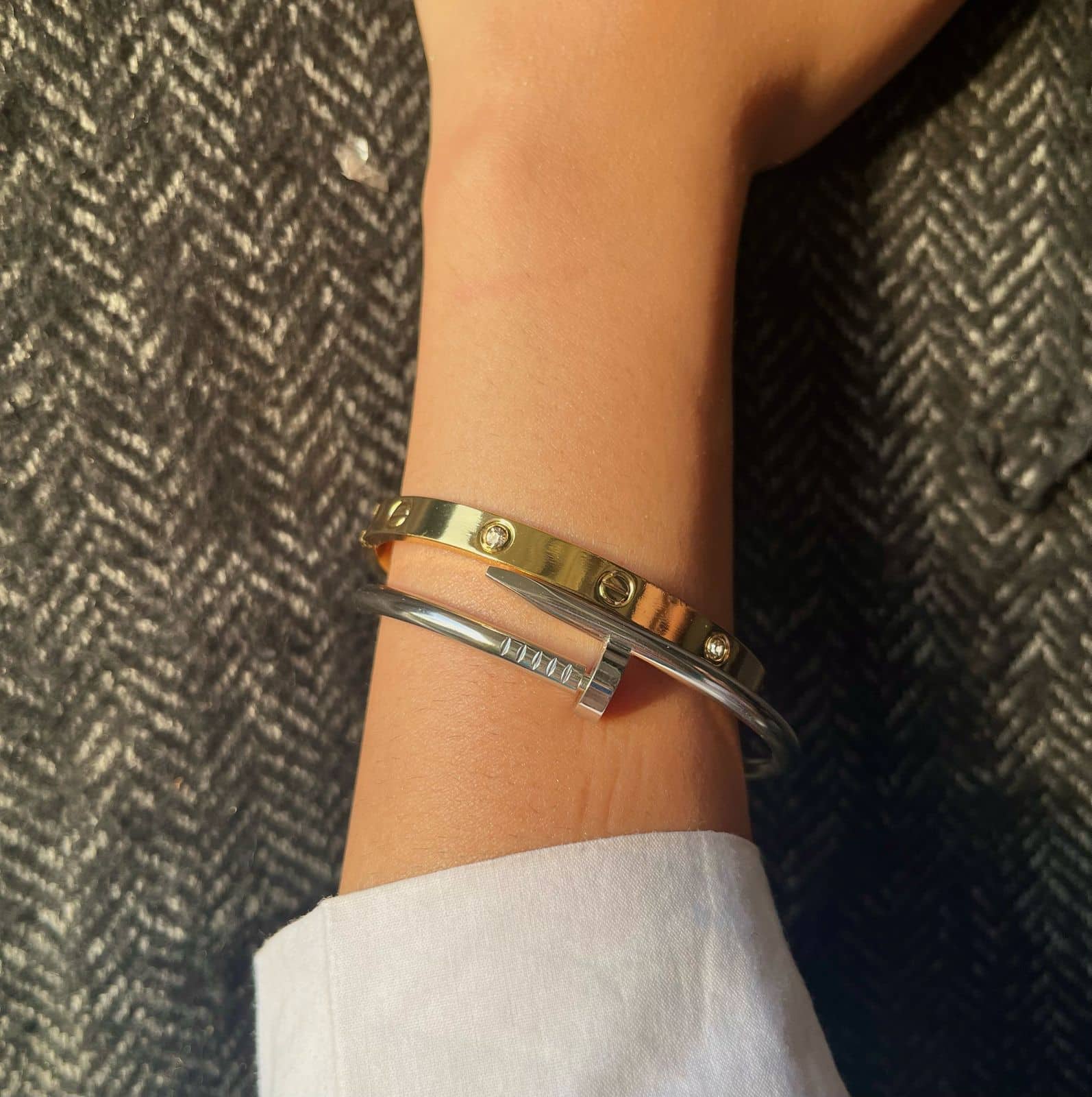Features a silver Cartier-inspired nail bracelet and a gold sleek love band
