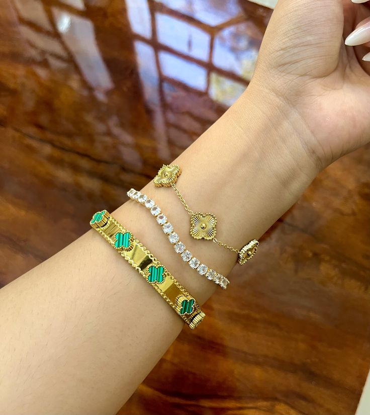This trendy 3-piece bracelet stack includes a Green Clover Kada, Gold Clover Bracelet and a shiny Tennis Bracelet. Perfect for layering or wearing solo, it adds instant glam to any outfit.