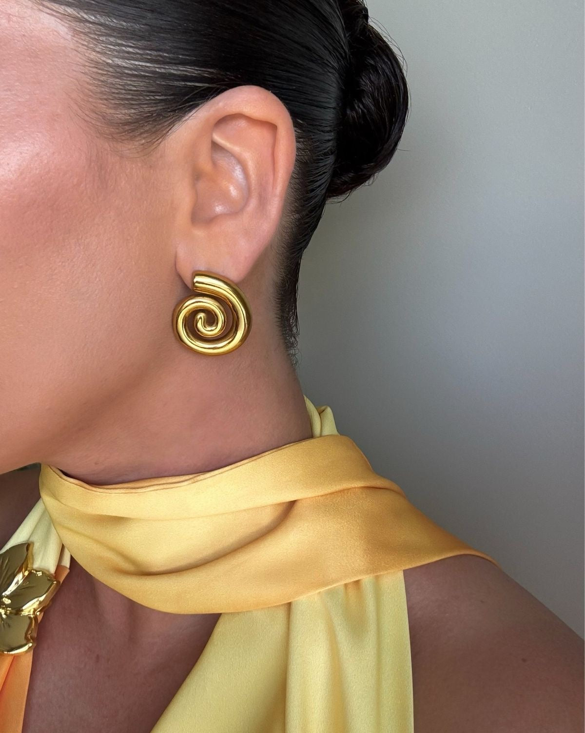 The Golden Swirl Statement Earrings are a bold fusion of elegance and artistry, crafted from high-quality, hypoallergenic stainless steel with 18K gold plating for a luxurious shine. Designed to be anti-tarnish, these earrings offer long-lasting brilliance and durability. The spiral-inspired design adds a unique and eye-catching touch, making them perfect for those who love statement jewelry. Wear them to elevate any outfit, whether it's a chic evening look, a stylish brunch ensemble, or a formal occasion. Their bold yet timeless appeal ensures they stand out effortlessly, adding a touch of sophistication and charm to your style.